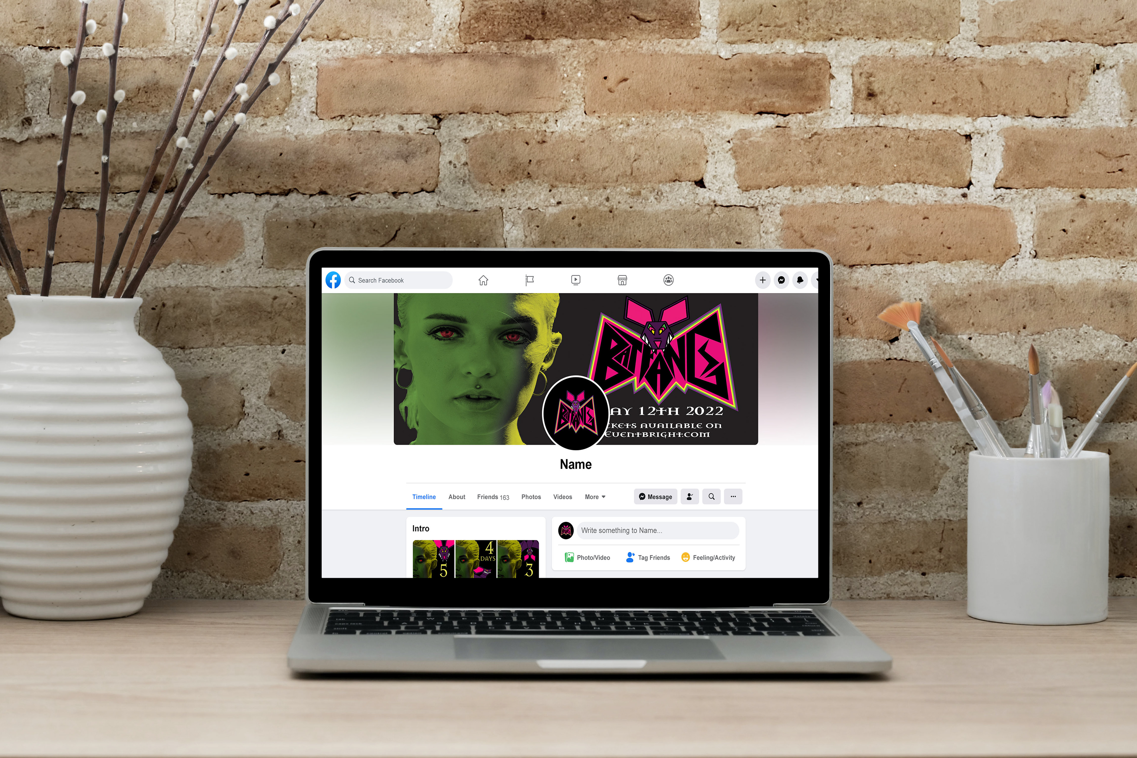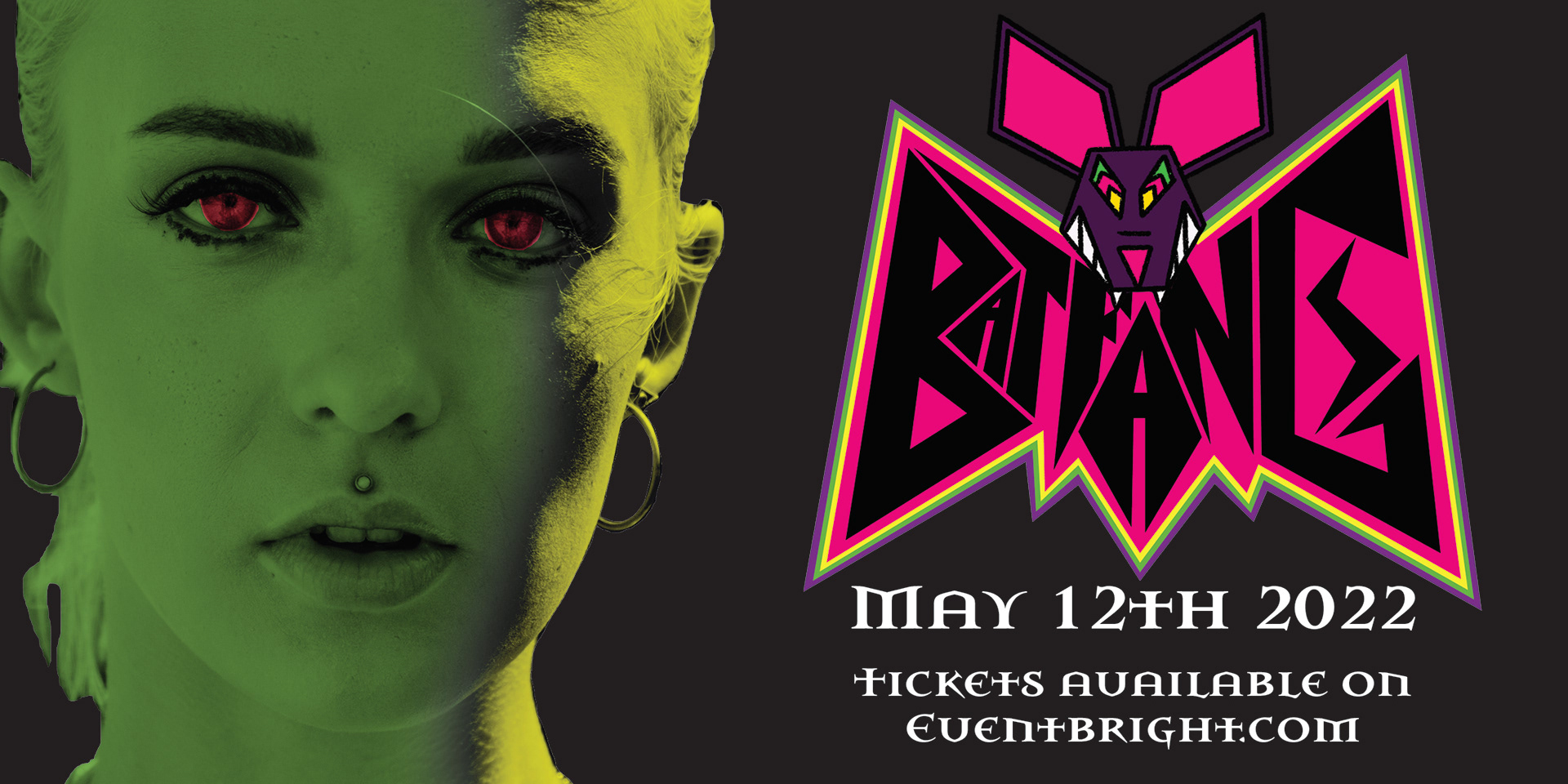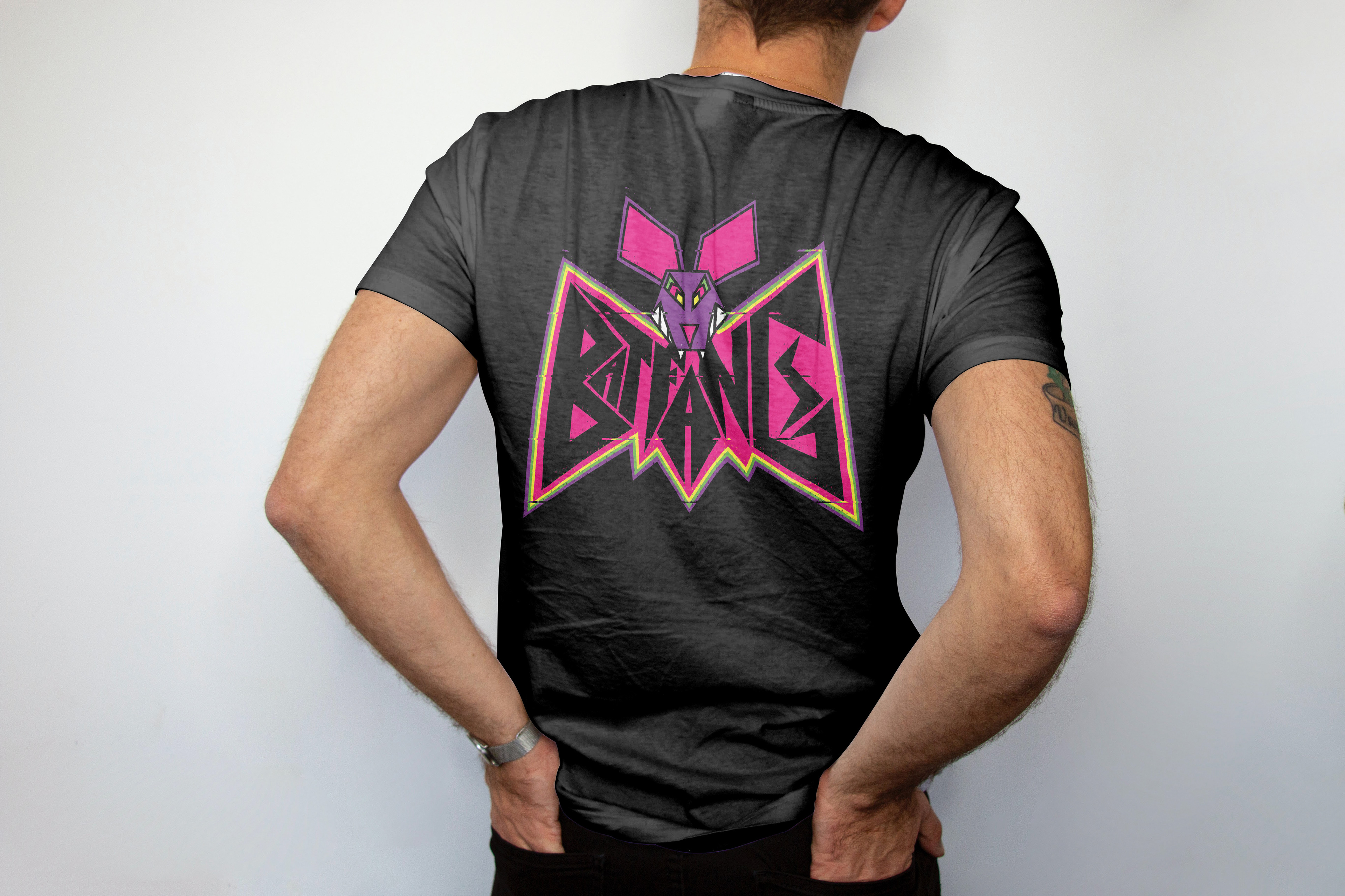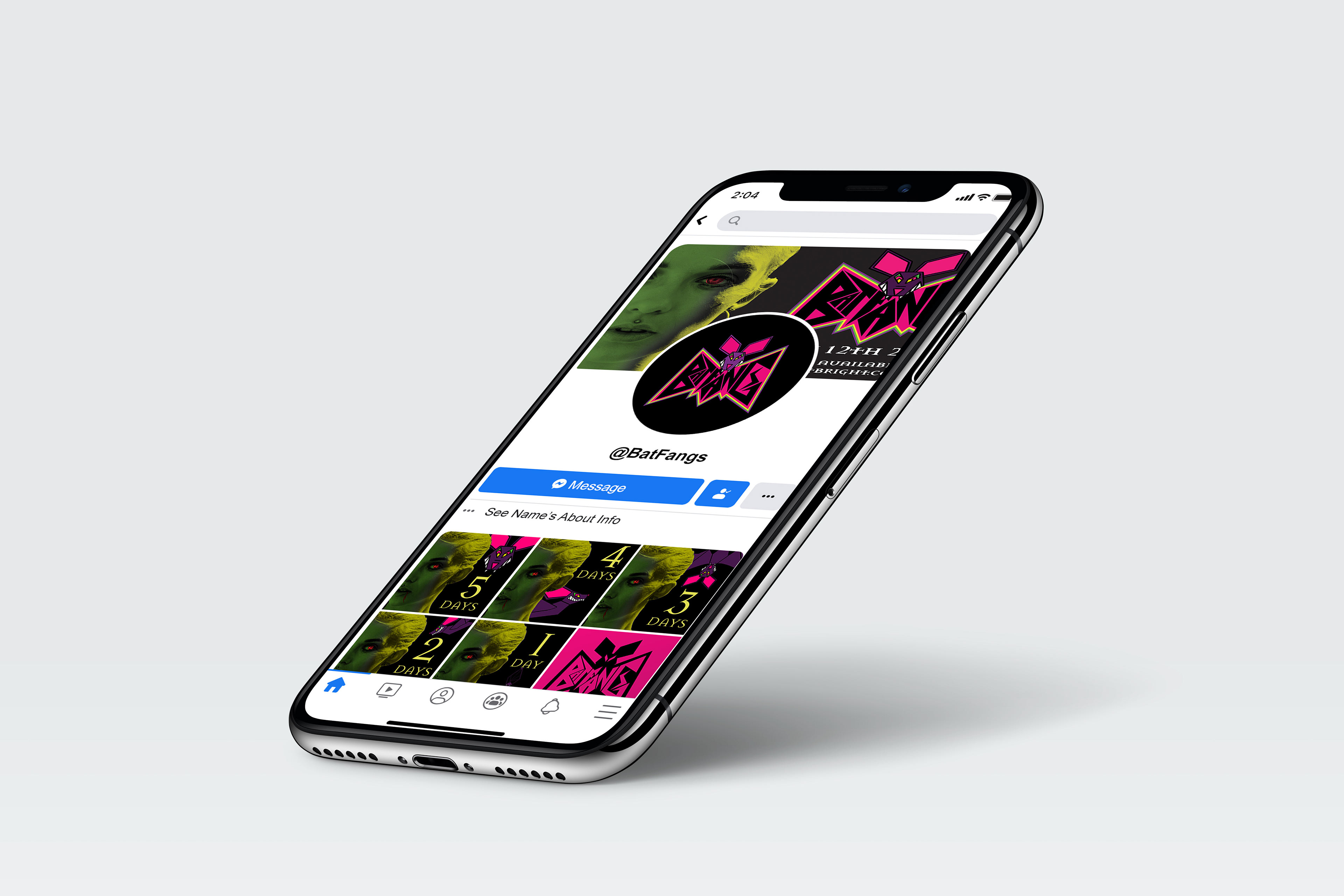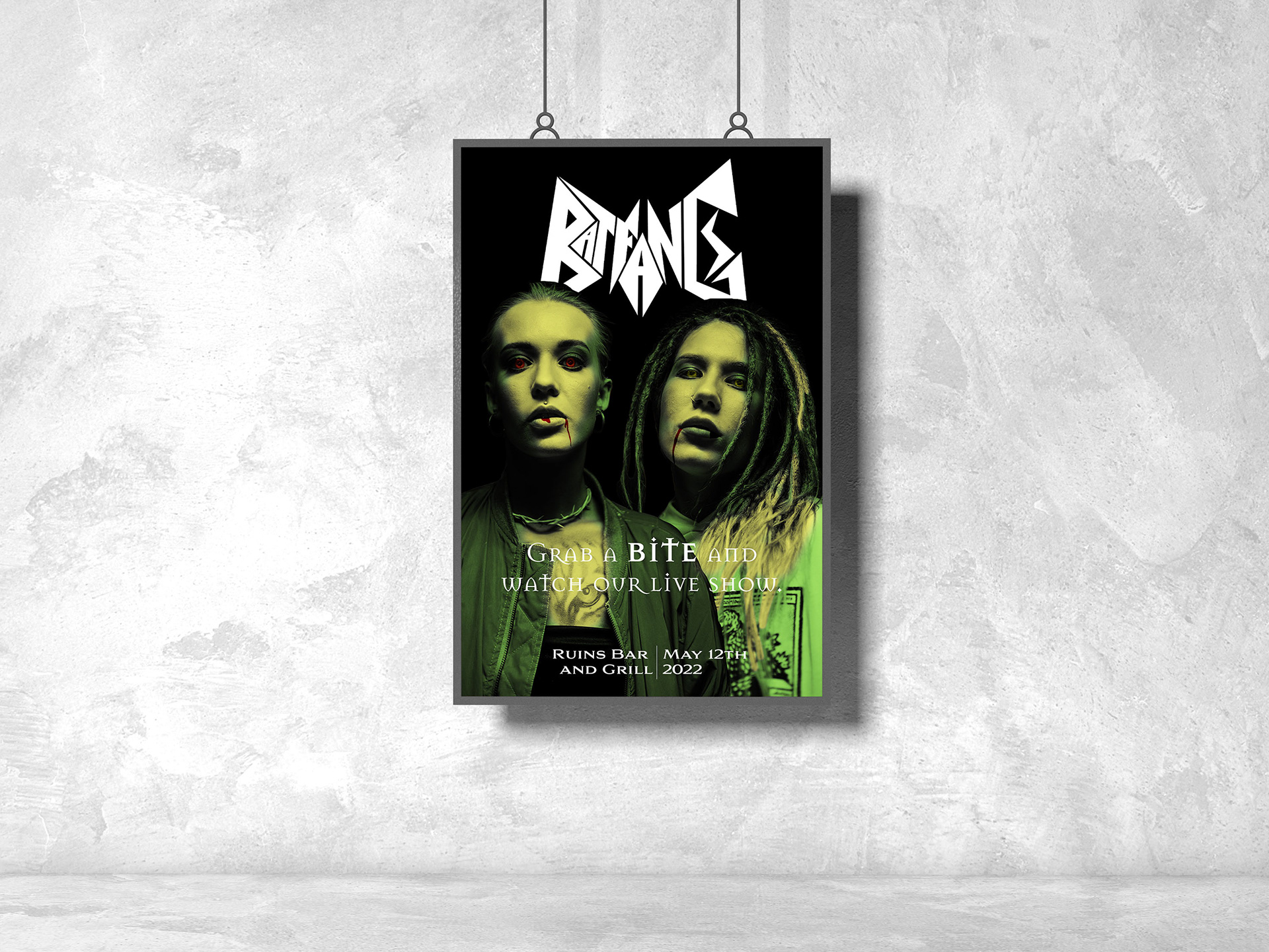 Event posts and merch for the band Bat Fang.